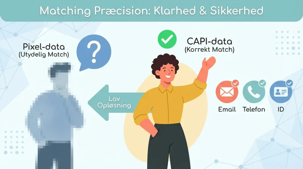 Når du bruger Conversions API (CAPI) sender du unikke “Match Keys” direkte fra serveren – f.eks. en hashed e-mail eller et telefonnummer fra dit checkout. Det svarer til at give Person B et navneskilt på – og nu ved Meta med 100% sikkerhed, at det var Person B der købte, og ikke Person A, selvom de sidder på samme netværk.