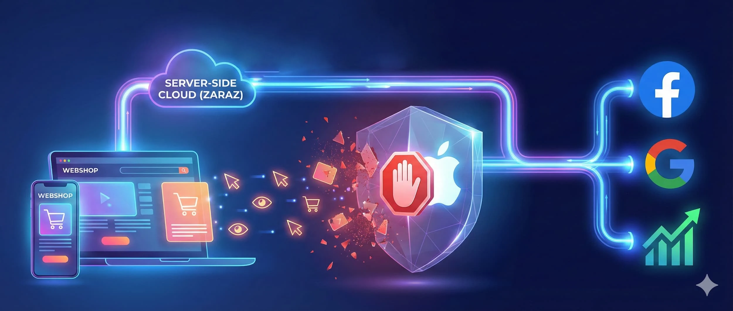 Zaraz er Cloudflares smarte alternativ. I stedet for at trackingen foregår i brugerens browser (hvor AdBlockers og iPhones kan blokere den), flytter Zaraz processen ud i “skyen” på Cloudflares servere.